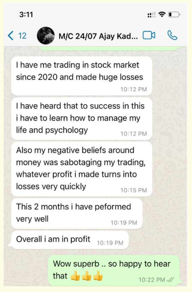 After Joining The Course, He Noticed A Change In His Mindset And Believe System Related To Money. He Was Making Huge Losses In Share Market Which Magically Turned Into Profit Within 2 Months Of Joining The Course. Ajay Has Seen A Huge Improvement In His Confidence Levels, Personality, Mindset And Is Very Happy With The New Him That He Has Discovered So Far